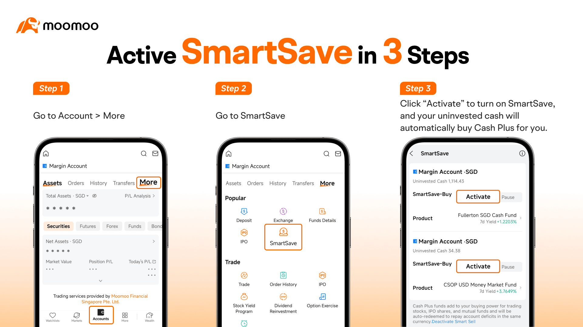 With SmartSave, premiums received are automatically invested into money market funds and other lower risk instruments so you can earn passive returns. This way, your idle funds can work harder for you as you wait for future opportunities.