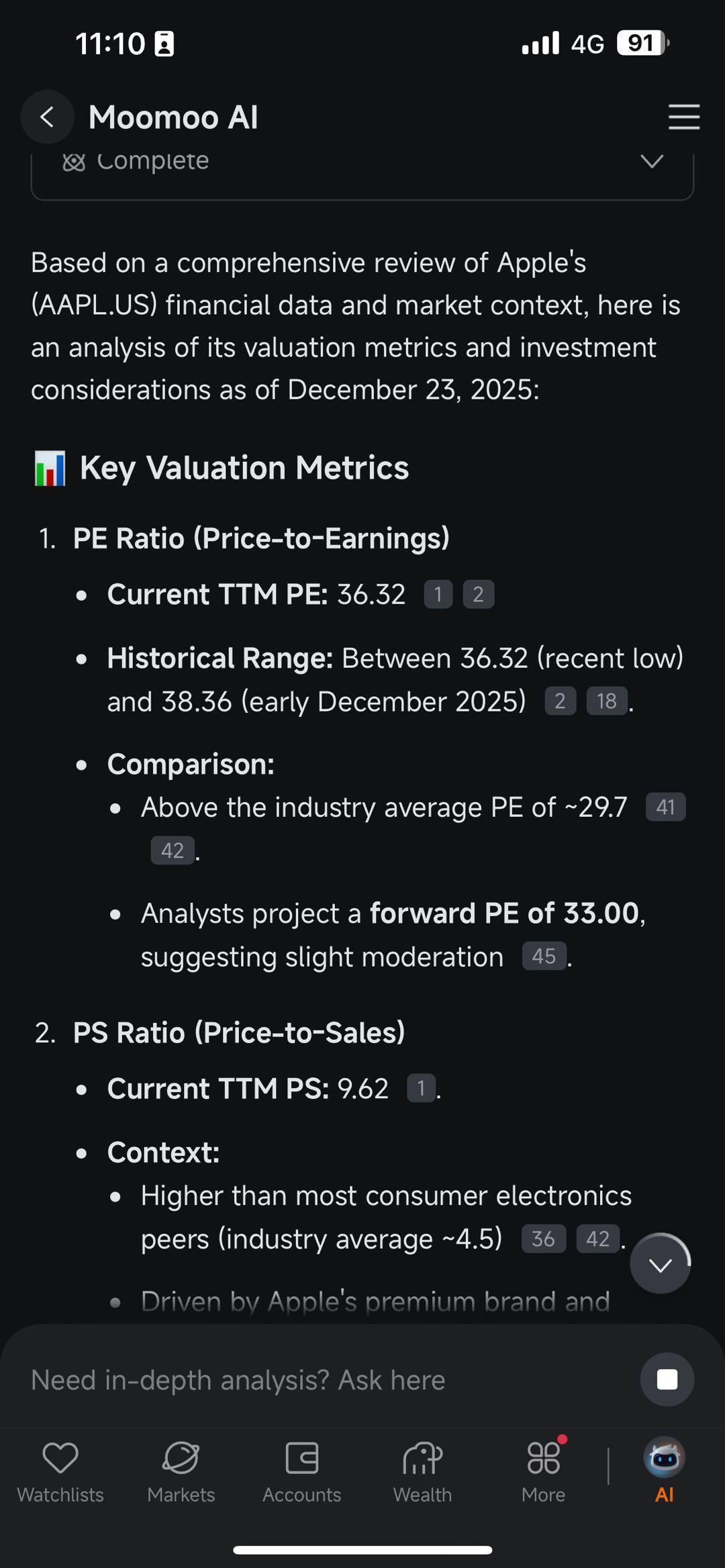Most impressively, you can also receive some help from AI. moomoo will provide detailed analyses of the valuation ratios for stocks you’re interested in trading. This can help clarify or strengthen your trading decisions.