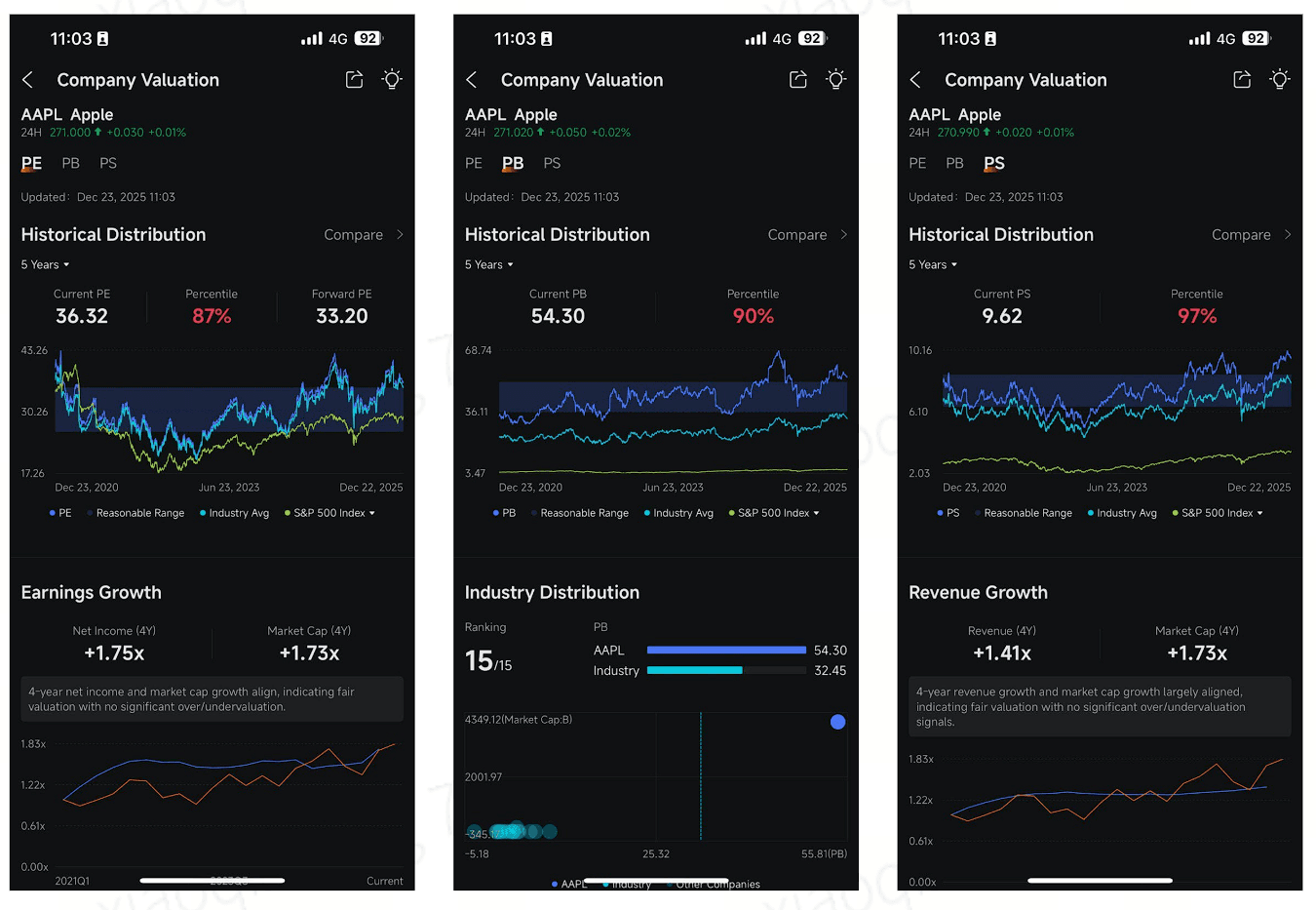 But that’s not all. moomoo will also display how the stock has performed relative to its peers and the broader market, providing an additional metric to gauge the company’s valuation. You can view visualized charts on P/E, P/B and P/S ratios, comparing against the S&P 500 market benchmark, as well as across specific industries or sectors.