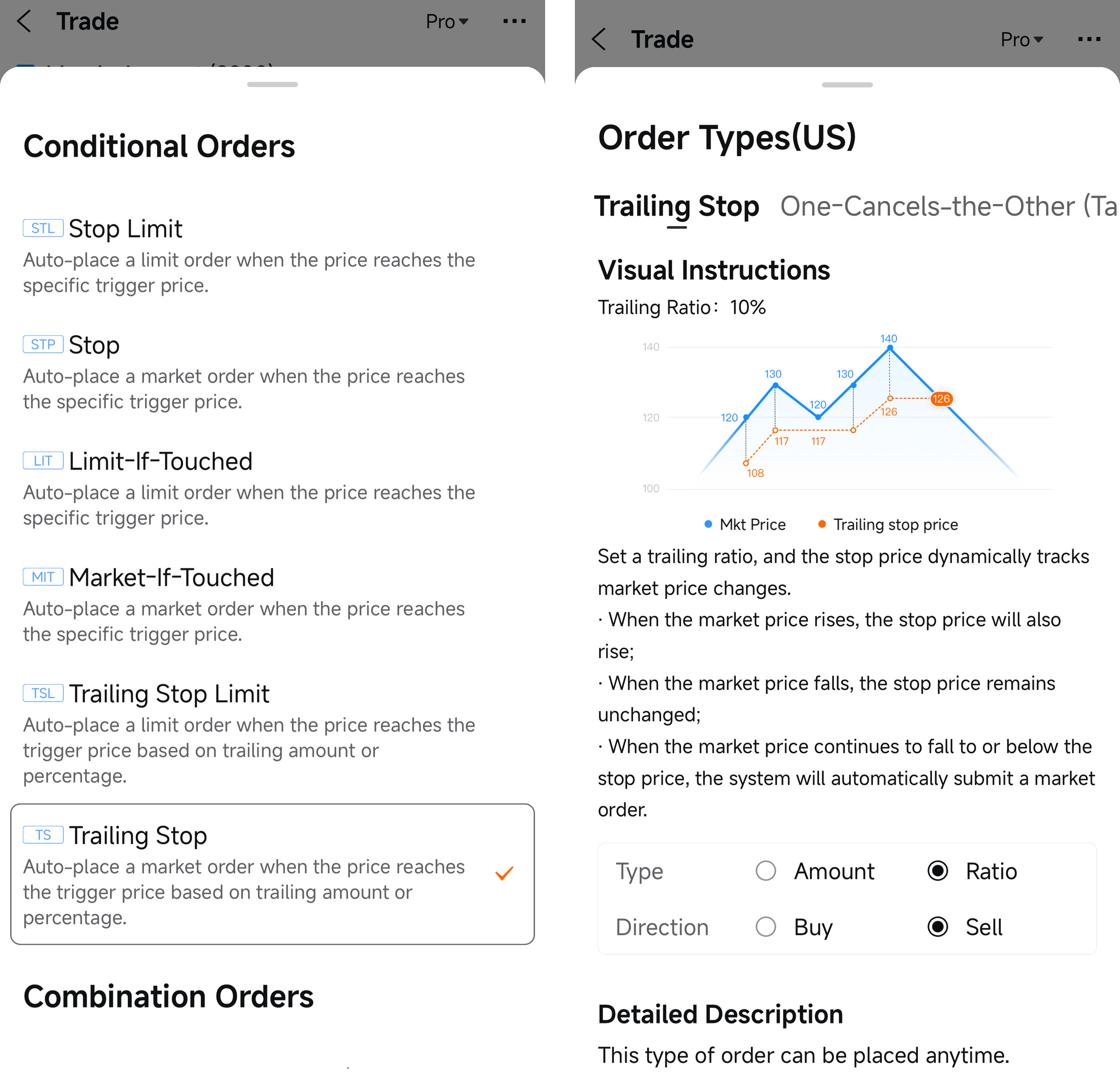 To help you better manage various market conditions, moomoo supports 10+ types of advance orders. This includes stop order, stop limit order, market if touched order, limit if touched order, trailing stop order and trailing stop limit order.