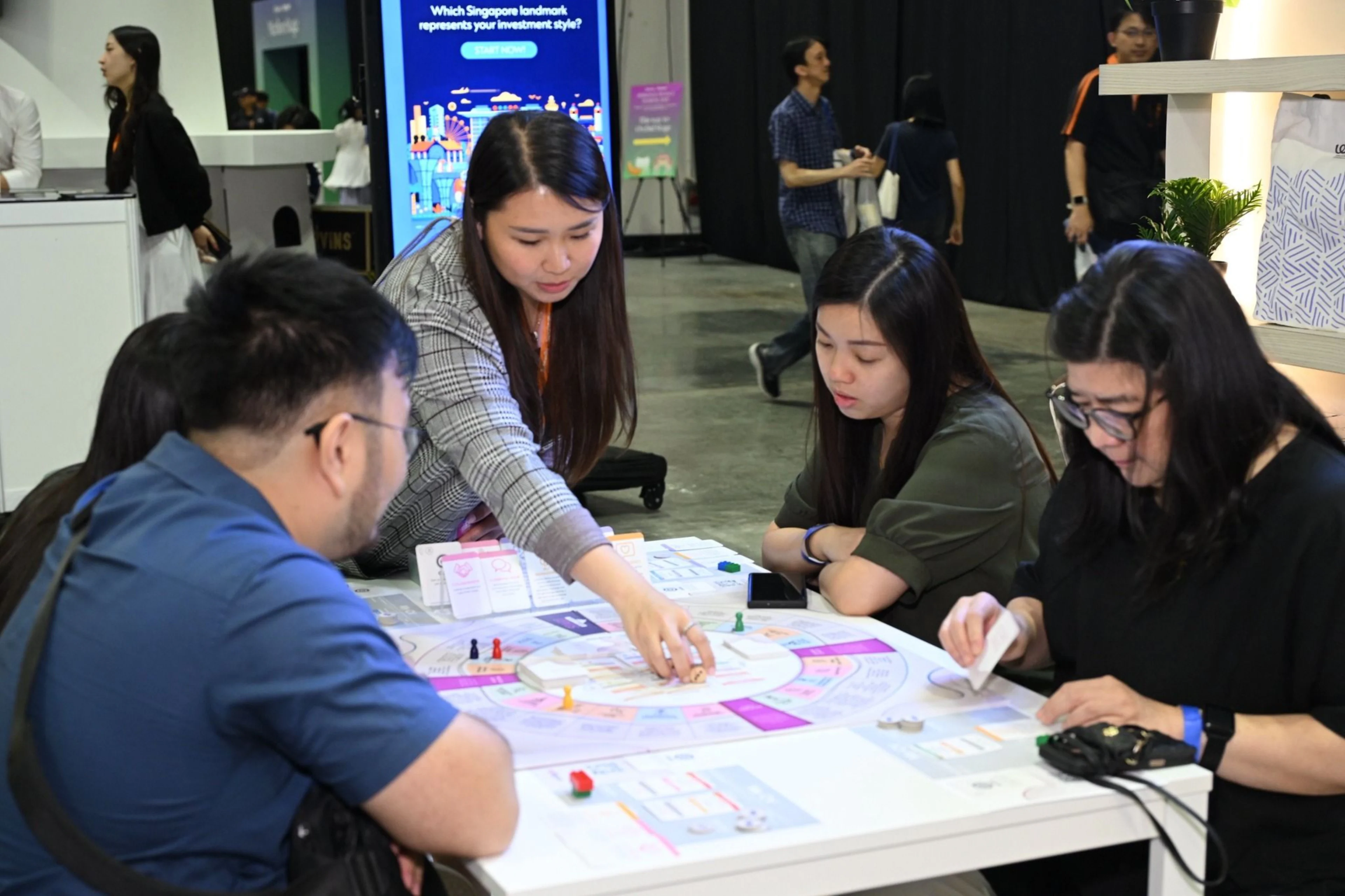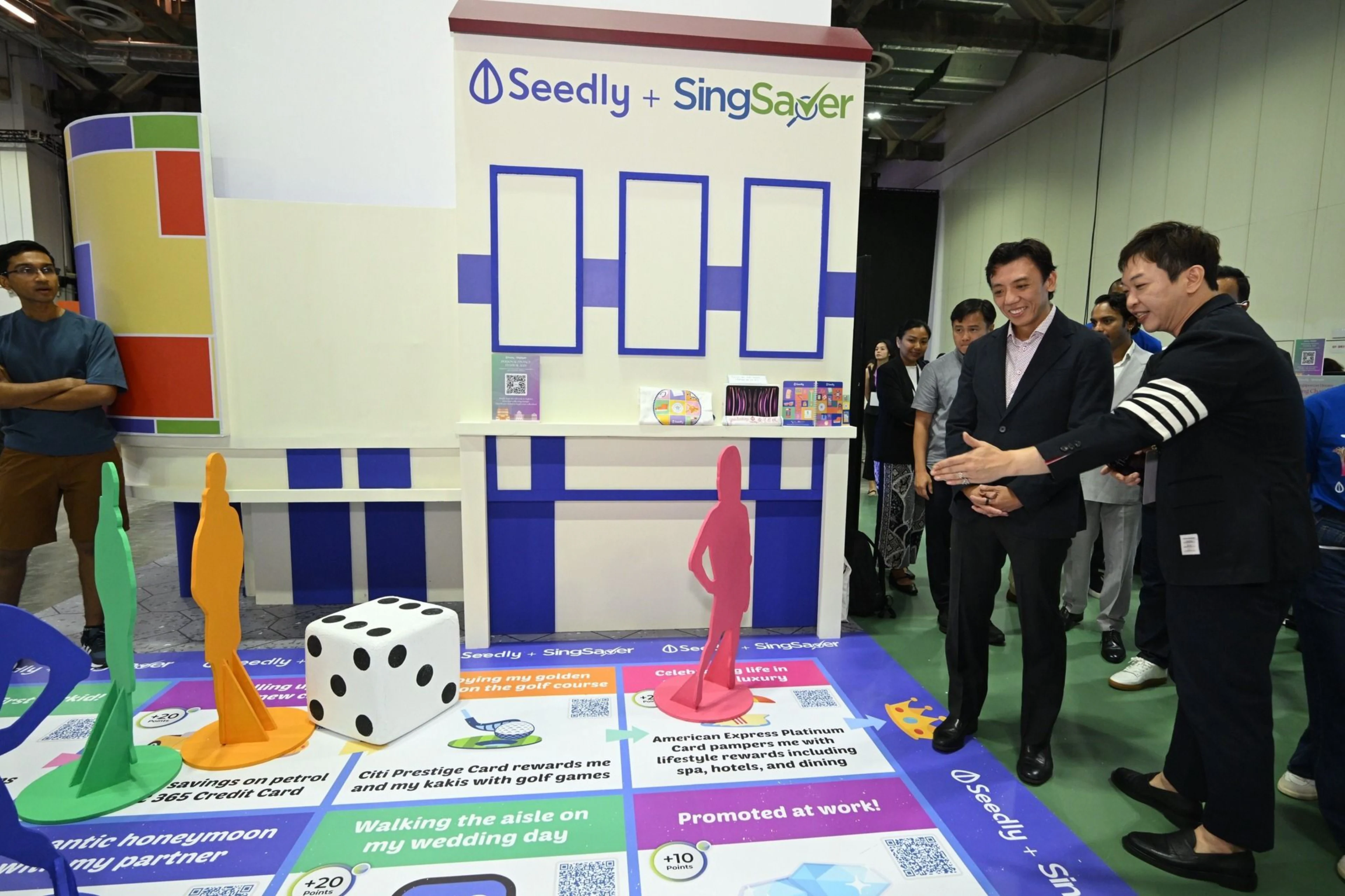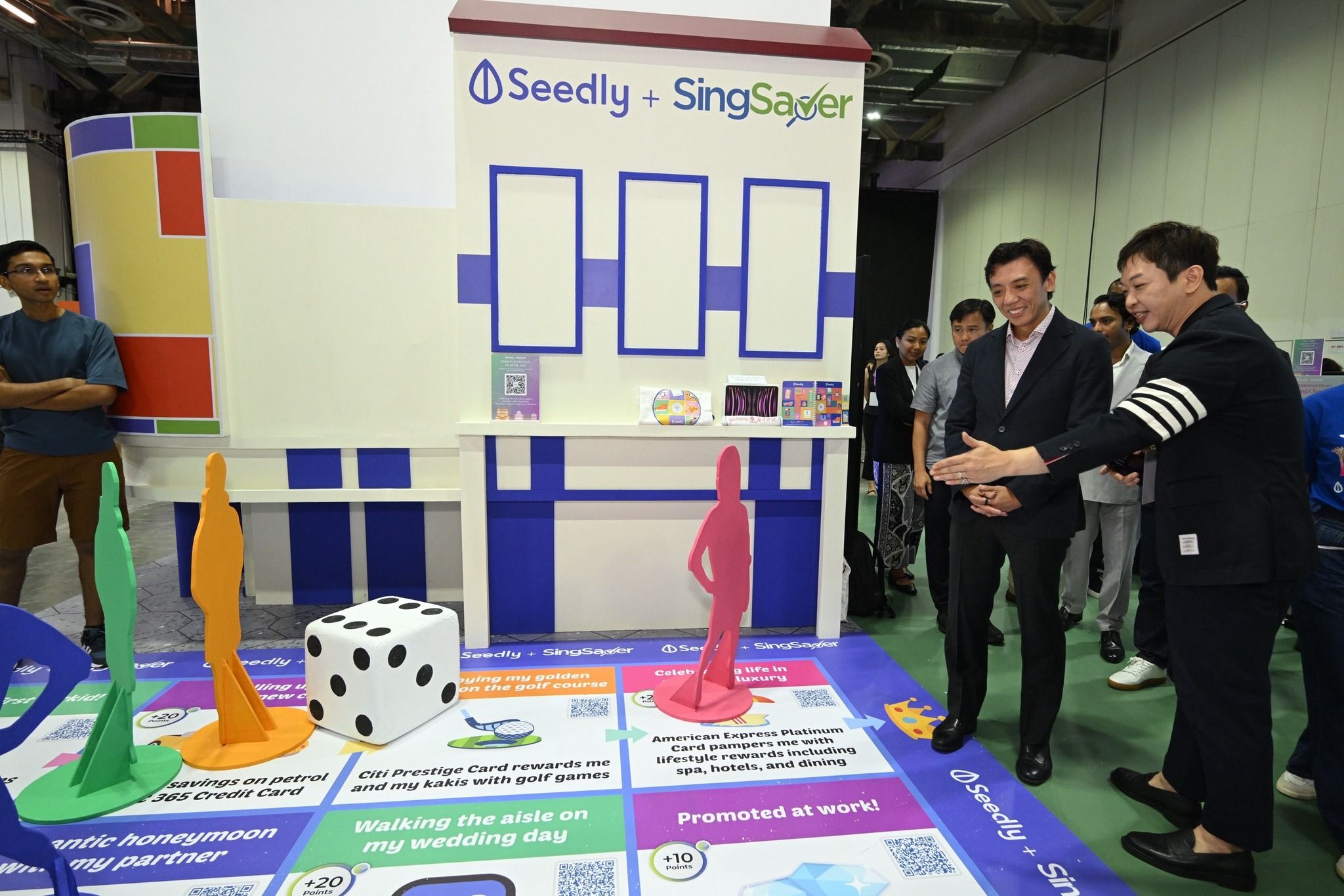 Not to be outdone, Seedly + SingSaver’s booth had participants play a life-sized board game, called Game of Cards, complete with a massive six-sided die. The Game of Life-inspired board showcased the strengths of different credit cards across activities and life stages.