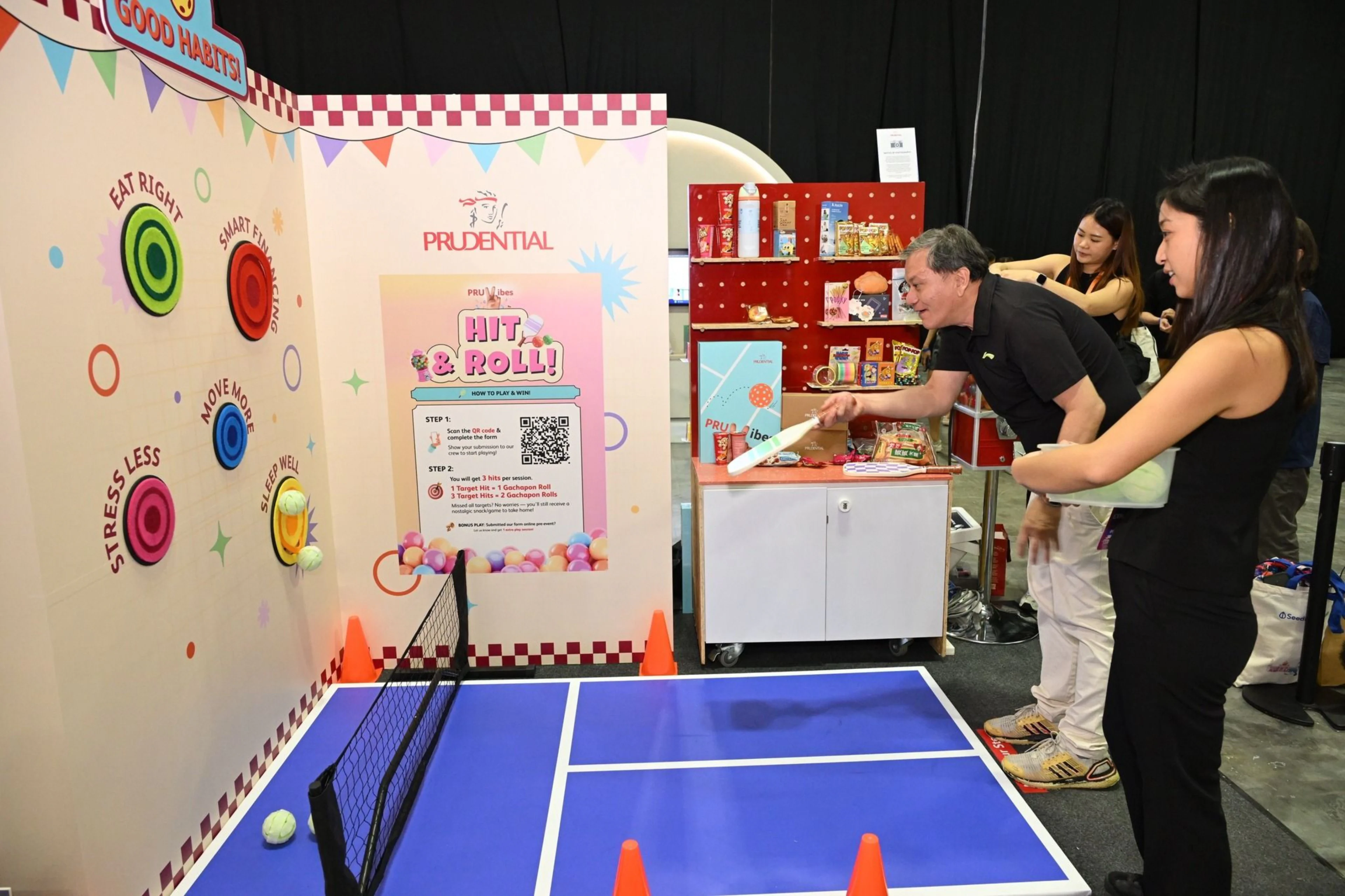 Prudential Singapore’s booth offered retro snacks and goodies to attendees who participated in a pickleball-themed Hit & Roll challenge.