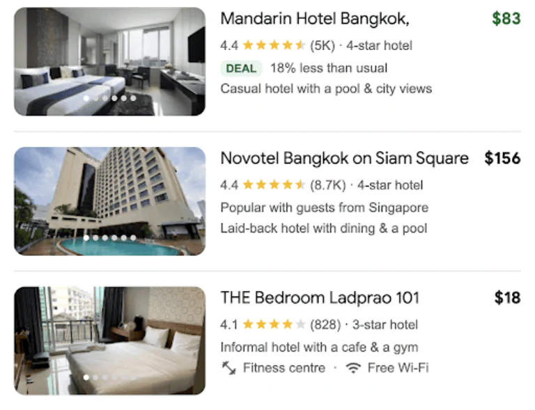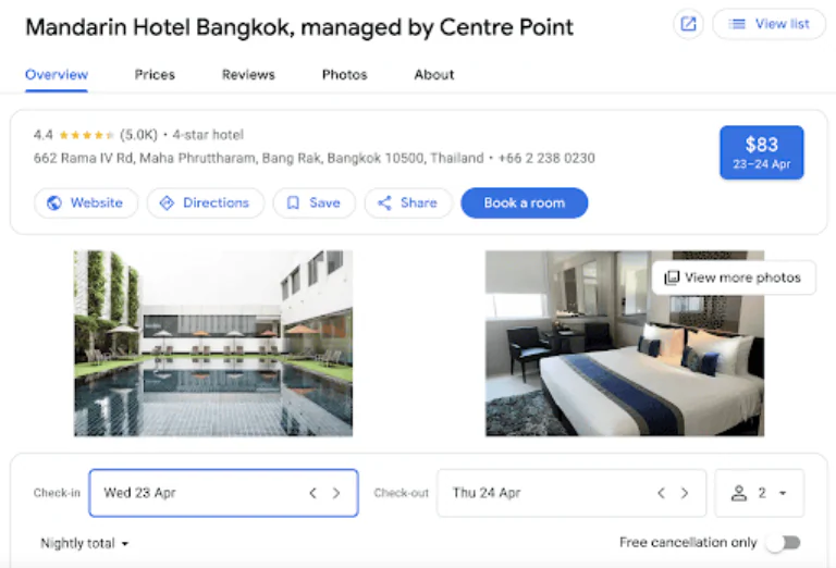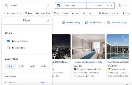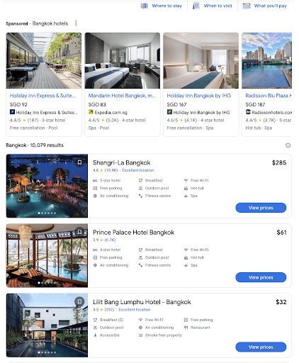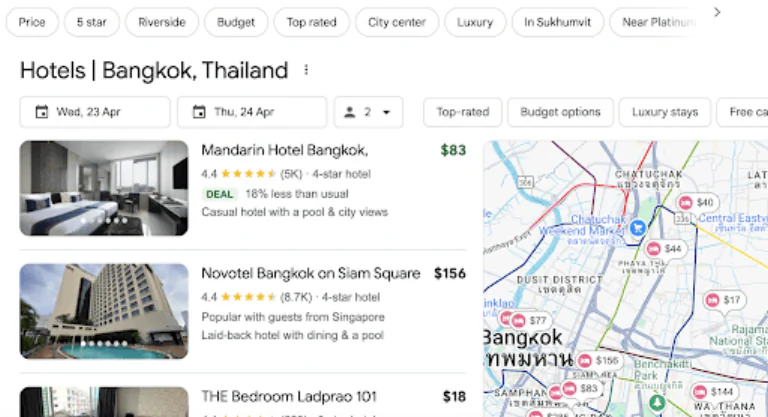 Search “hotels in Bangkok” in your Google search bar for example. You’ll get a mini version of the same tool embedded within the results — complete with a map and filters. Click “View all hotels” to expand.