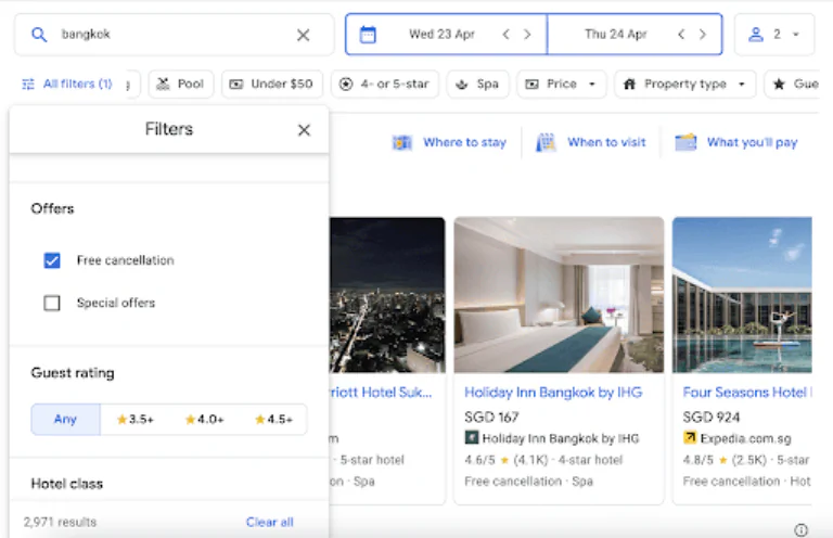 Whether you’re planning a long weekend in Bangkok or a birthday staycation at Sentosa, Google Hotels can help you compare rooms, check deals, and find places with that all-important infinity pool. It's part of the wider Google Travel suite, which includes tools for booking flights, finding attractions, and now — hunting down your perfect hotel room.