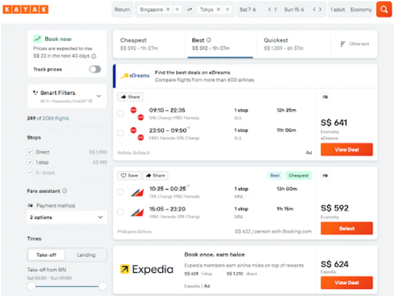 When searching for flights, Kayak allows you to refine your results using a variety of helpful filters, including departure times, airlines, stopovers, and more. This can be particularly useful for Singaporeans booking multi-leg trips or who are looking to travel during peak periods.