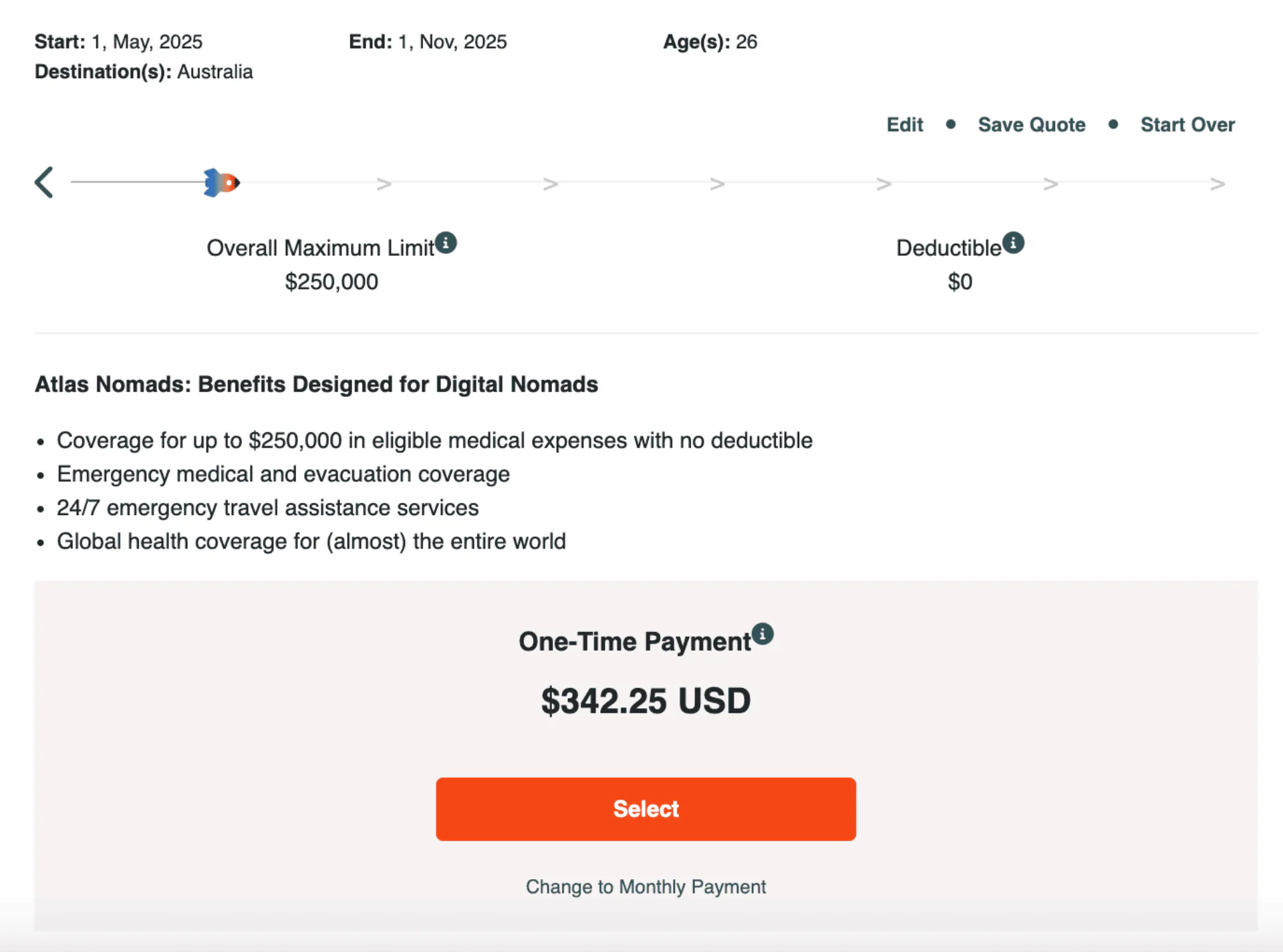 Their International plan for digital nomads starts at $52 USD (about $69.94 SGD) for 28 days of coverage, with the ability to extend. Their Premium plan provides more coverage and allows you to choose your deductible, coverage length, and overall maximum coverage.