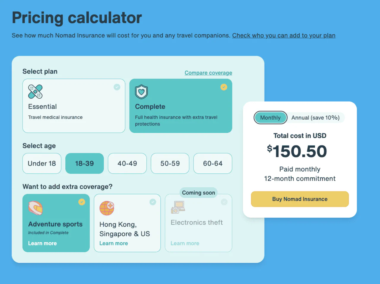 SafetyWing is a budget-friendly, flexible option for digital nomads and long-term travellers from Singapore. Its Essential plan costs $56.28 USD ($75.70 SGD at the time of writing) while its Complete plan costs $150.50 USD per month ($202.43 SGD) and $1625 USD annually ($2185.70 SGD).